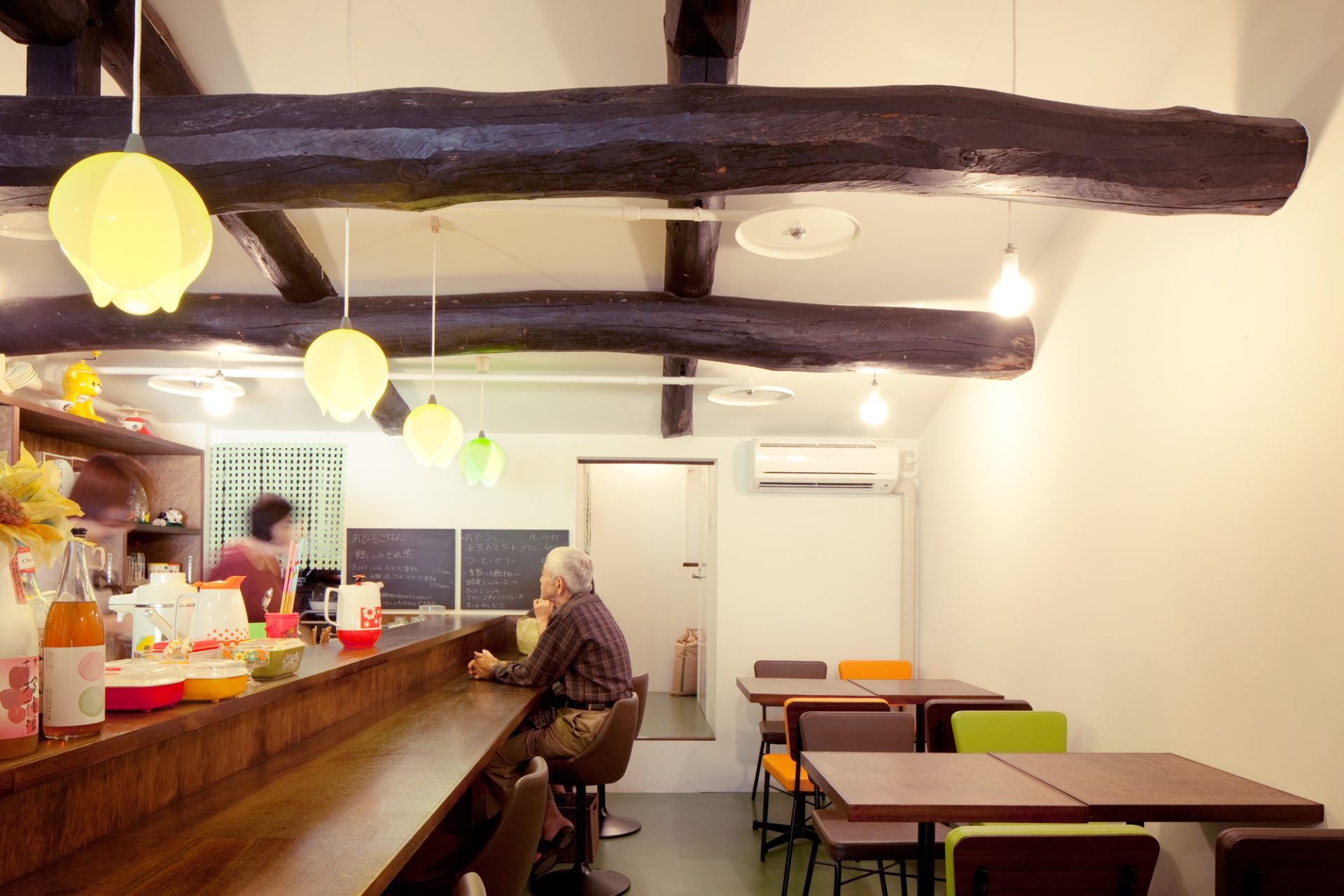 らいおん建築事務所は、インテリアデザインと施工監理を行いました。シンプルな白い内装にすることで、既存の大丸太の梁の存在感を最大限に生かしながら、水玉の食器とカラフルな昭和レトロな雑貨が引き立つようにしています。