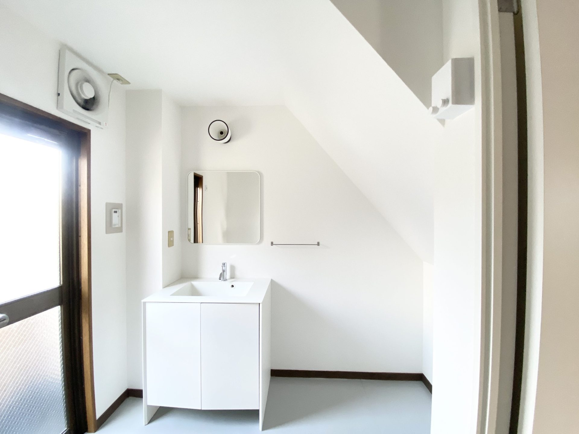 洗面所に取り付けているブラケット照明は、既存の照明を使用し、改修前のレトロな雰囲気を残しつつ、新しい洗面台と壁掛けミラーを設置して、天井・壁・床の仕上げを一新して明るい水回りになりました。