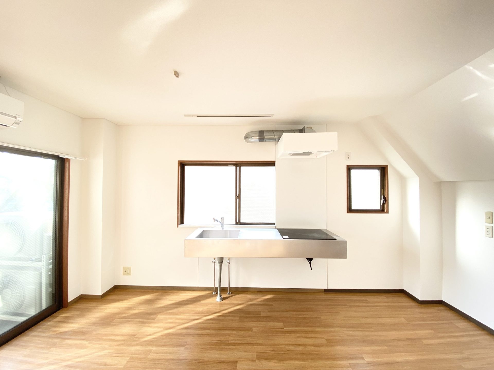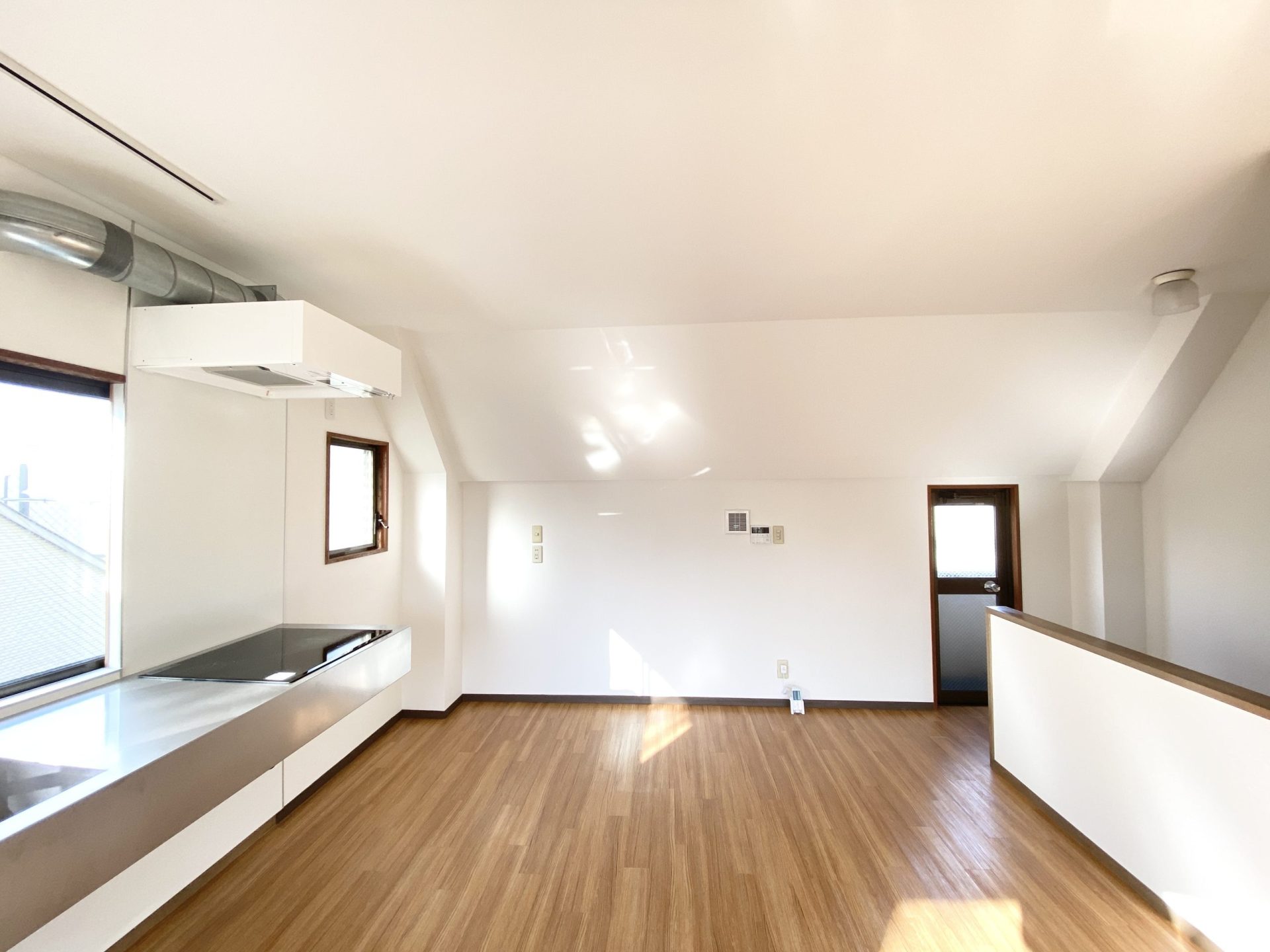 3階のキッチンの位置を変更し、廊下の間仕切り壁を撤去して洋室およびダイニング・キッチンだった2室を1室にまとめた間取りへ改修しました。日当たりの良い3階はゆったりとしたリビング・ダイニング・キッチンとなり、家族団らんの時間を過ごせる空間を作り出しました。