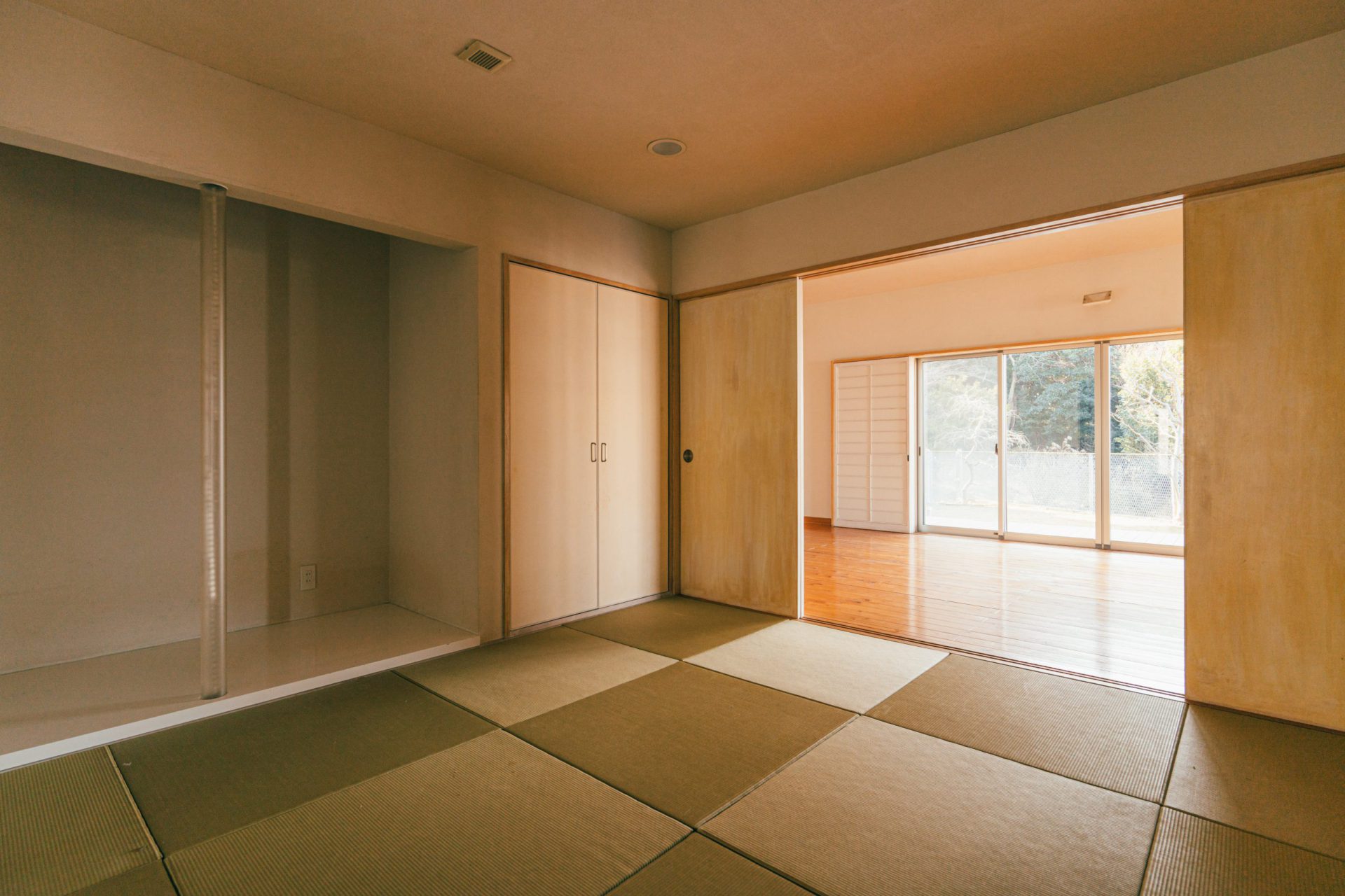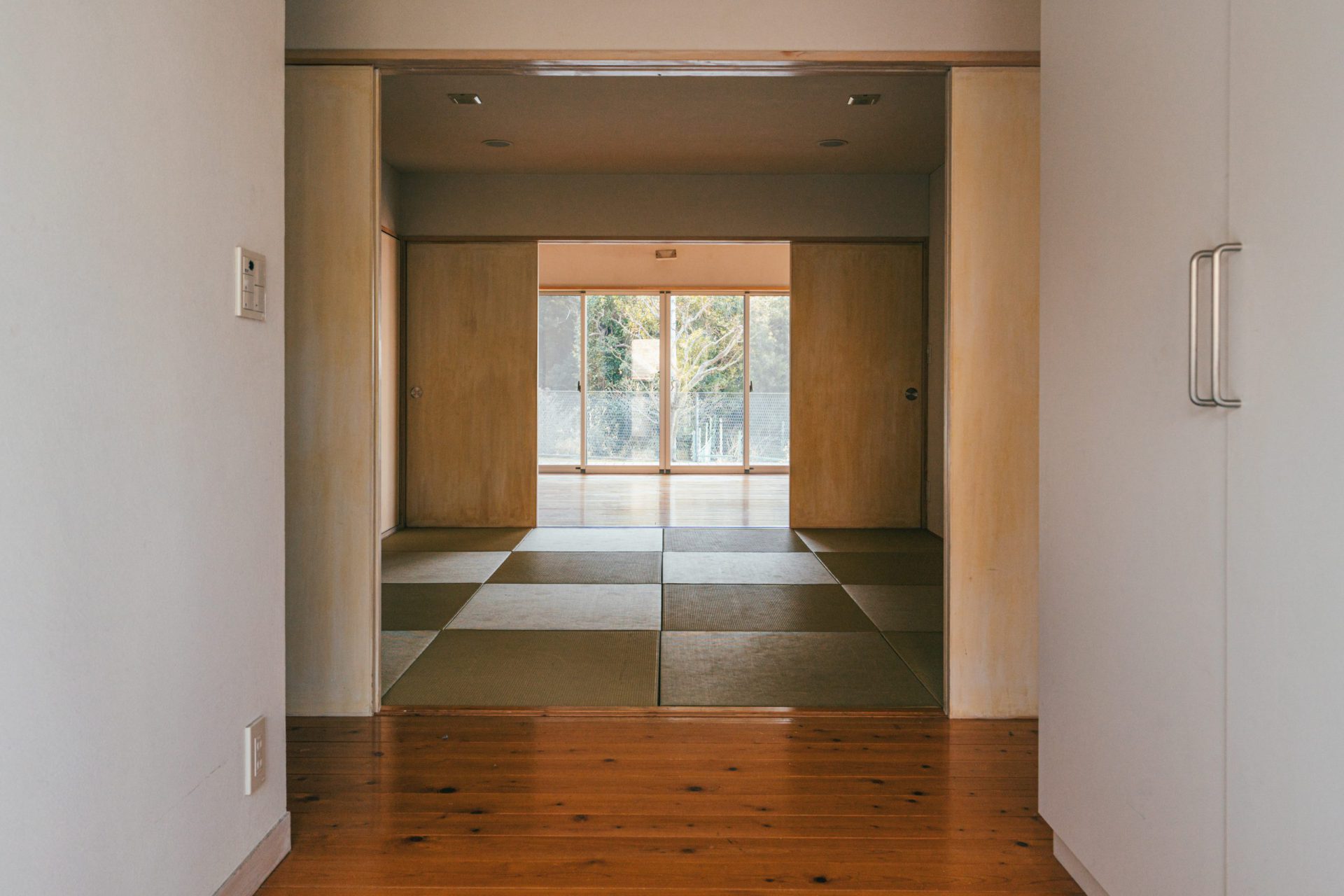 玄関から入るとすぐに和室があり、その扉を開けると、和室とリビングを通して斜面の豊かな緑を借景とする奥の庭まで一続きで抜ける空間になります。