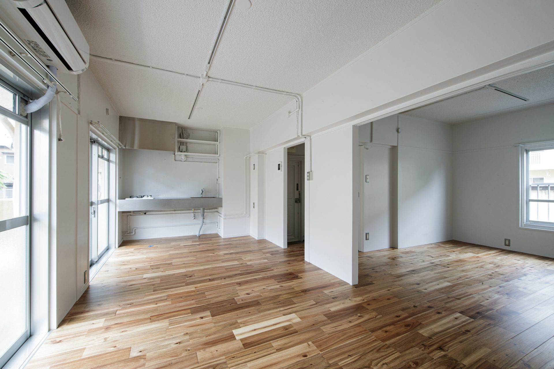 「らいおん建築事務所」としては、日本郵便株式会社が所有する旧社宅を民間事業者が日本郵便から一括借上げ、民間賃貸住宅(一部店舗)として転貸事業を行うという再生活用の提案と、企画・プロデュース・事業のコーディネートを行いました。株式会社ルーヴィスによるリノベーションが行われることになり自主施工のリノベーション工事部分の設計・工事監理を行いました。
