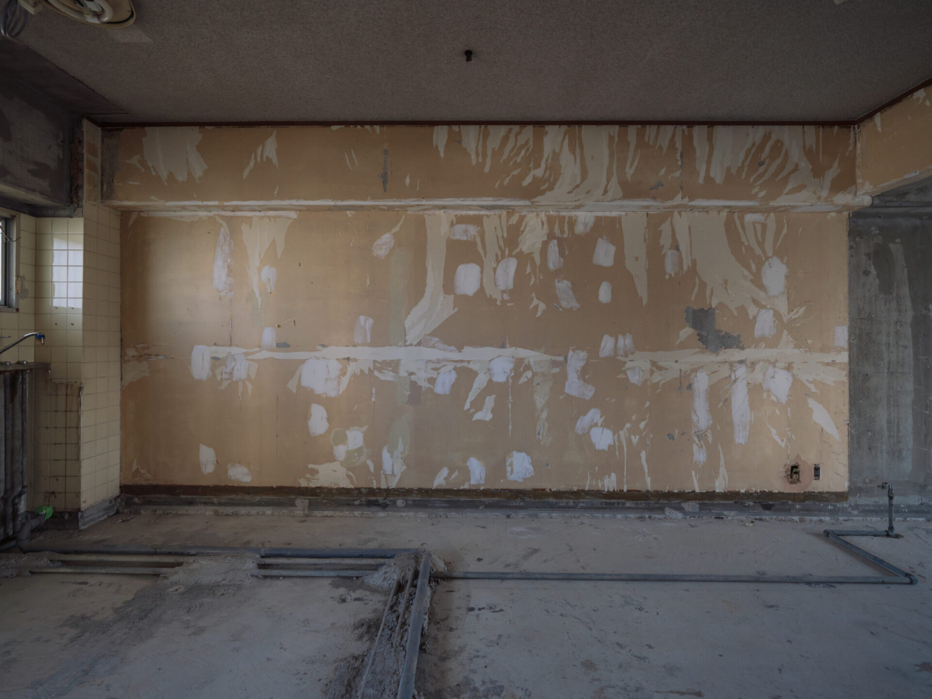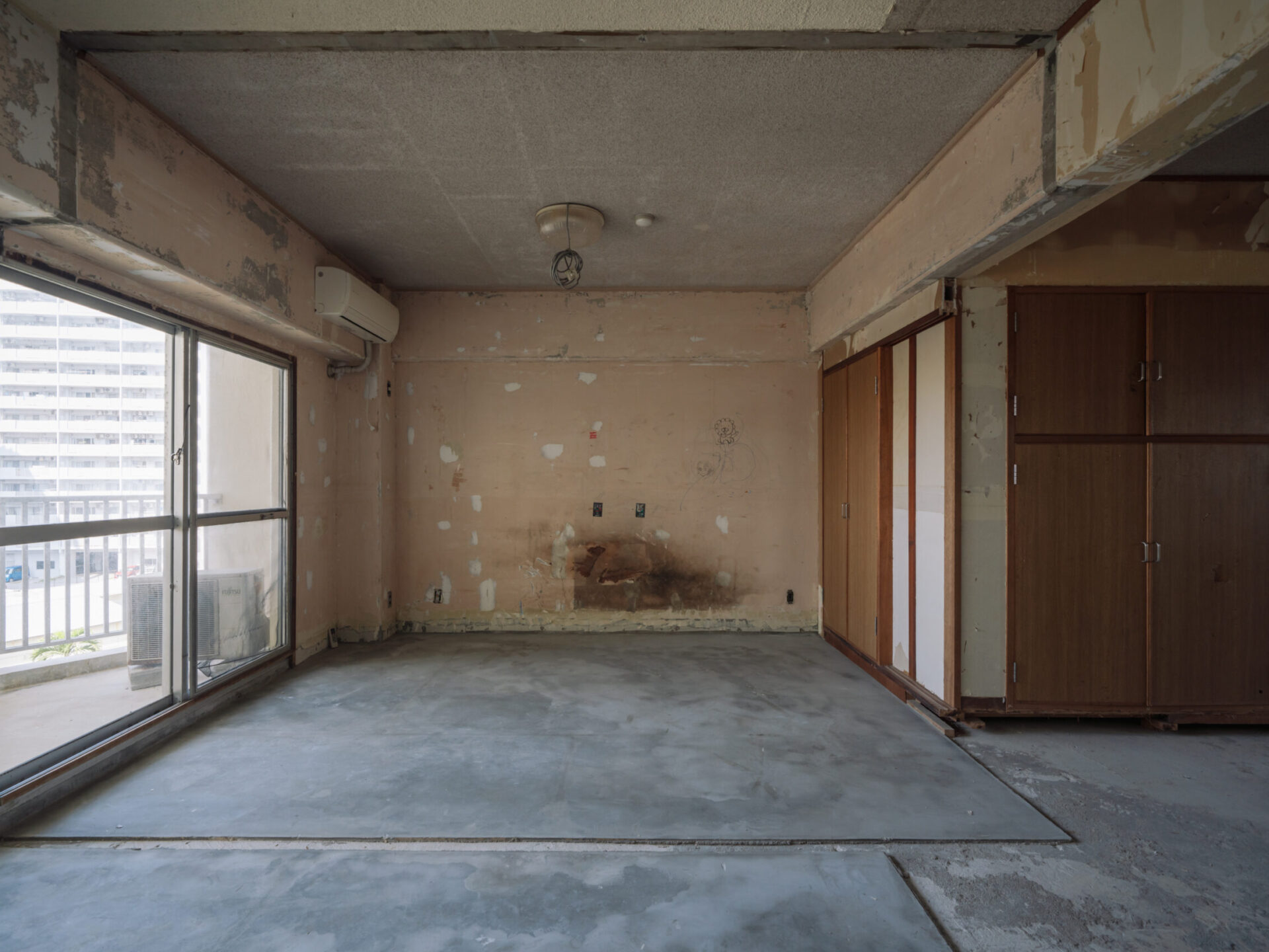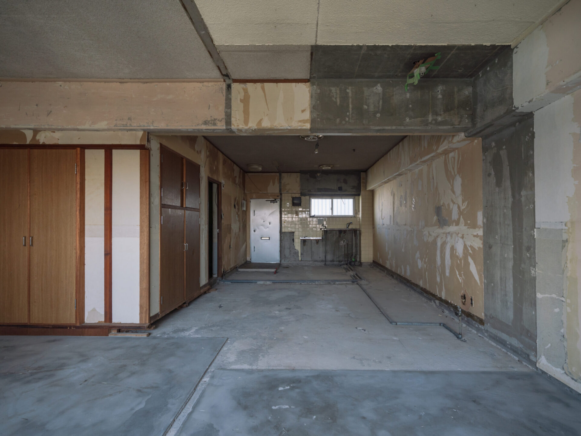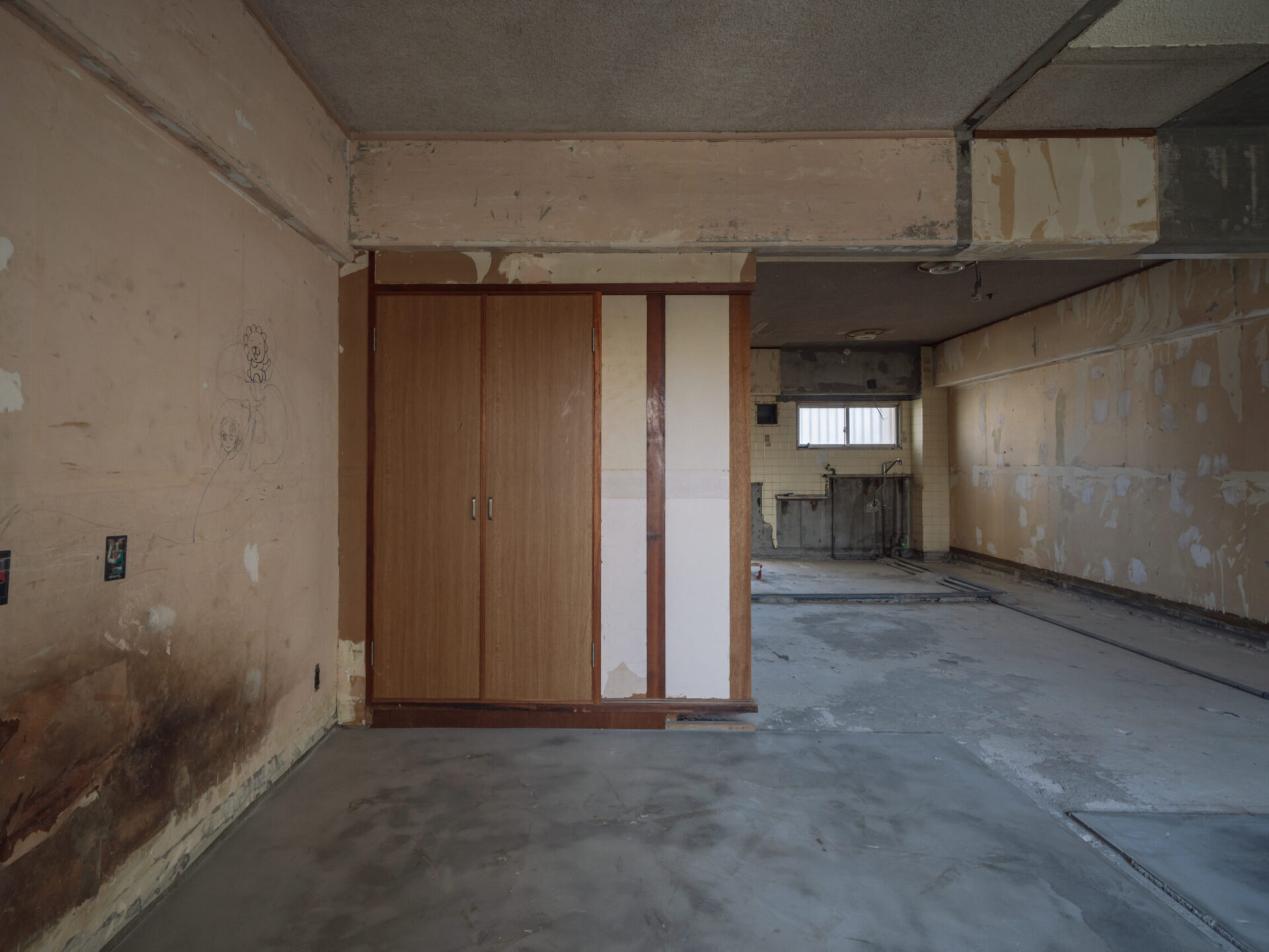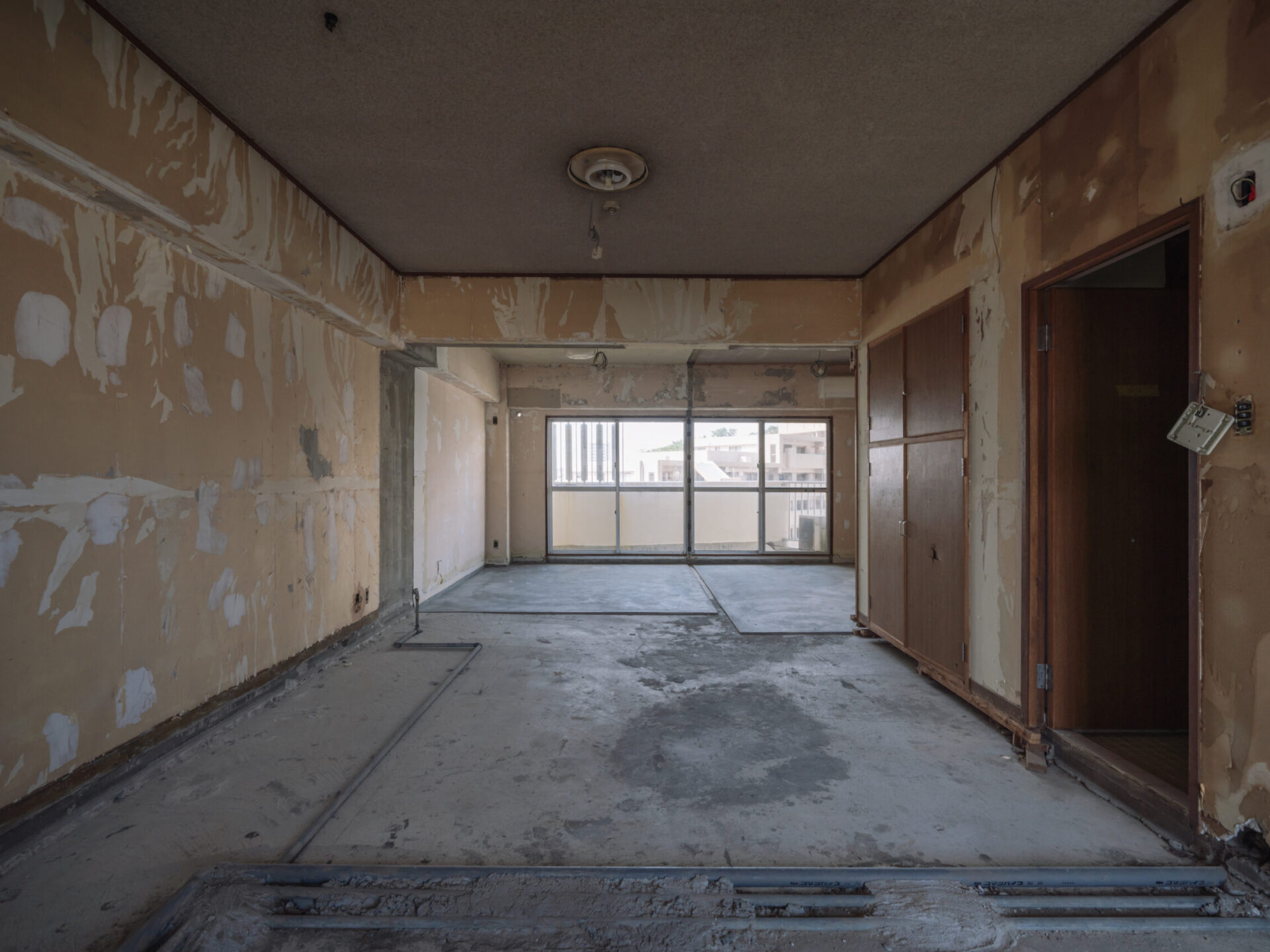 既存ベースビルの平面プランは、よくある、いわゆる2DKの間取りです。ですのでバスルーム・水廻りと間の間仕切りだけ残して部屋の間仕切りは全て撤去することにしました。