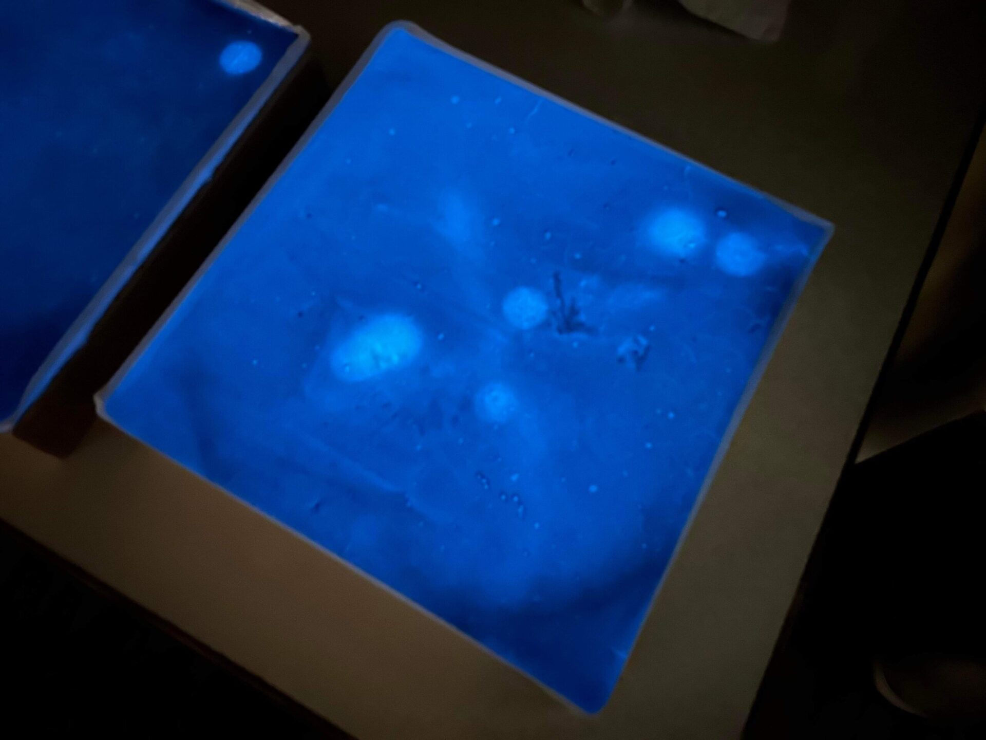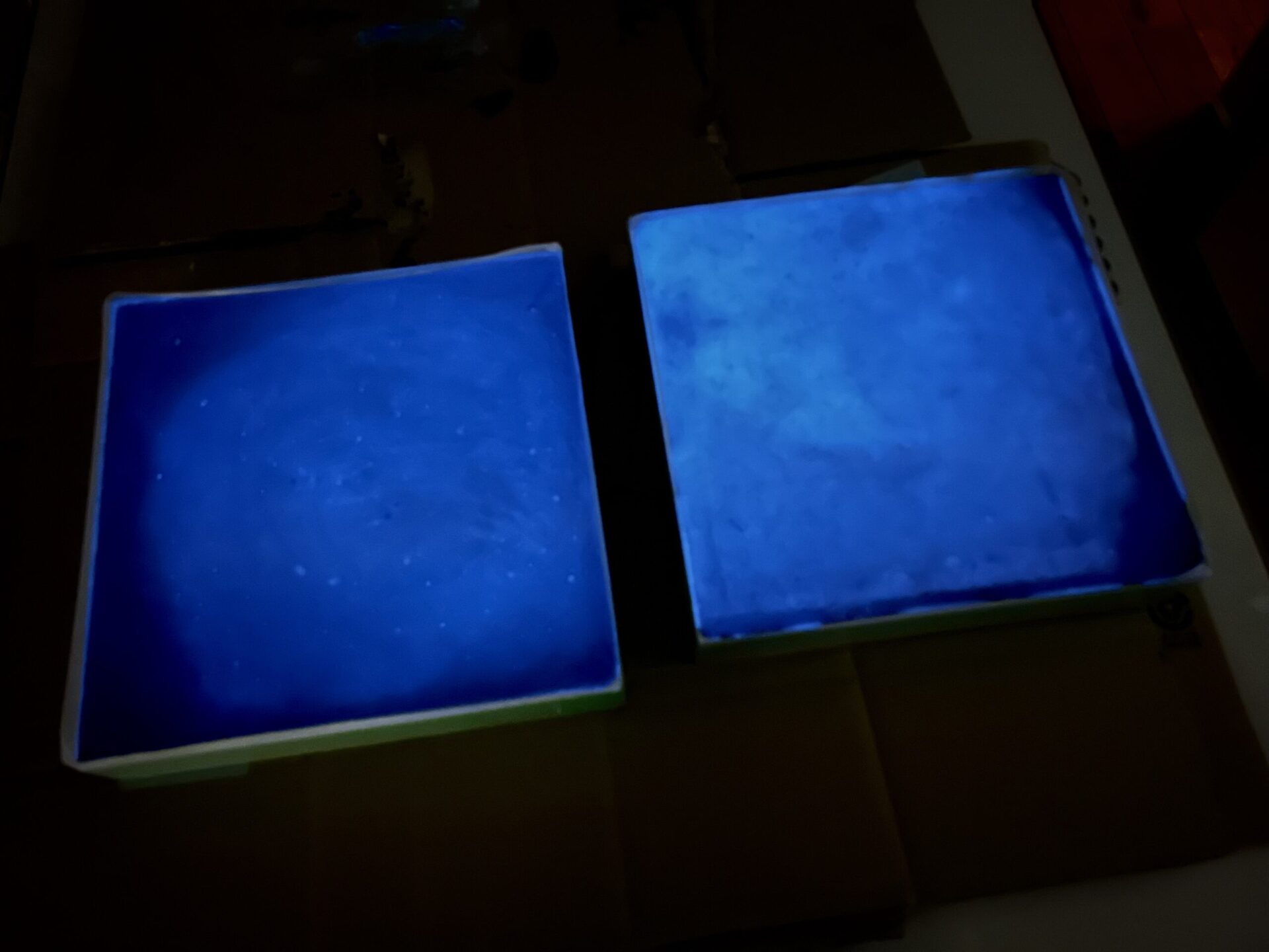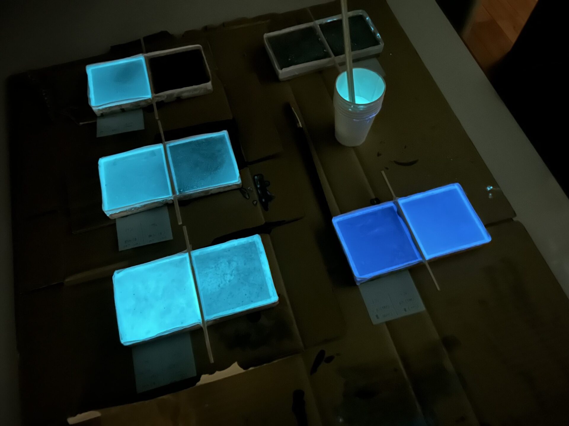 蓄光塗料はどれぐらいの分量を混ぜるかも味噌で、分量が多くてもエポキシに混ぜた時に白濁してしまうし、少なすぎても綺麗に光りません。そしてエポキシの種類を変えたり、蓄光塗料の分量を調整したサンプルをいくつか作成し、エポキシの透明度が高く、暗くした時にしっかり光る蓄光エポキシ樹脂が完成いたしました。