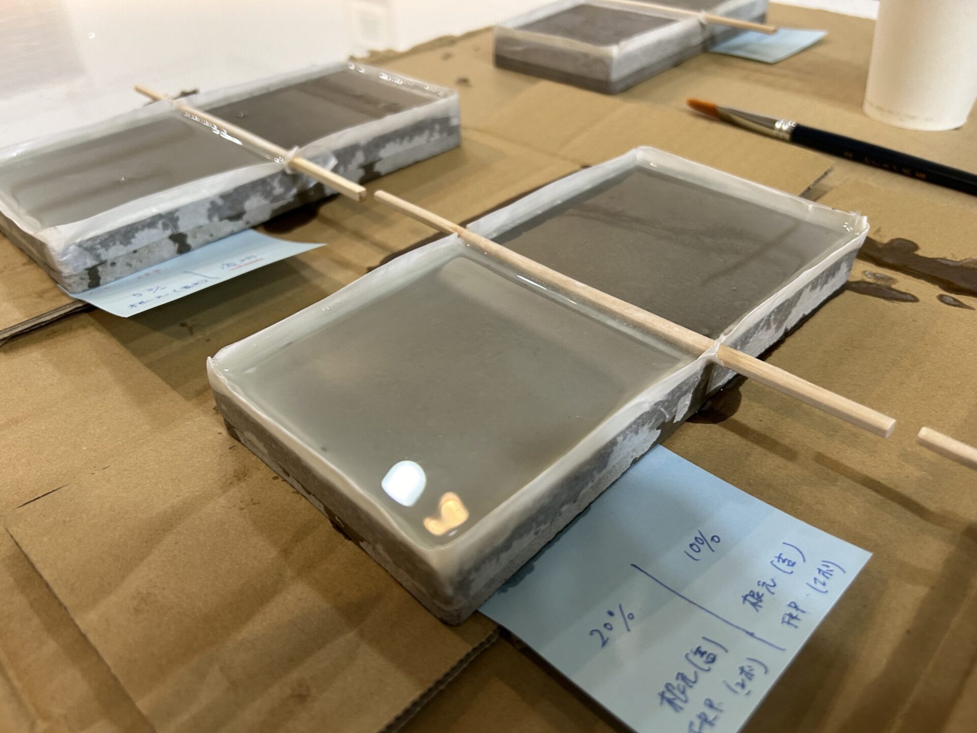様々なメーカーさんのエポキシを取り寄せ、ヒアリングをしながらサンプルを作成し、透明度が高く黄変しづらいエポキシを見つけました。